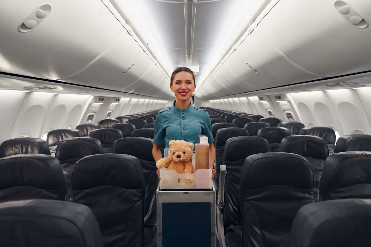 Flight Attendant Happily Holds a Teddy Bear